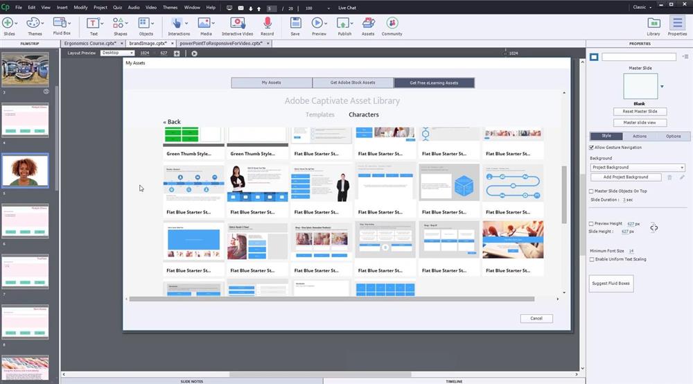 Adobe Captivate programında çalışma alanının ortasında projede oluşturulacak sayfalar düzenlenir. Sol tarafta yer alan Filmstrip bölümünde projeye eklenen slaytlar yer alır. Sağ tarafta Library ve Properties seçenekleri yer alır. Library seçeneği projeye eklenen resimler, arkaplanlar, sesler, formüller vb. özellikleri barındırır. Properties seçeneği ise slaytlar ve slaytlara eklenen tüm nesnelerin özelliklerinde düzenleme yapılabilen yerdir. Properties açıldığında yanında timing ile birlikte gelir. Timing seçeneği seçilen objeye ait geçiş efektlerinin ya da zamanlama özelliklerinin ayarlandığı paneldir. Ekranın en altında bulunan timeline ise zamanlayıcıdır. Bu seçenek ekranın ve ekrandaki nesnelerin ne kadar süre ekranda görüneceğinin ayarlandığı paneldir.