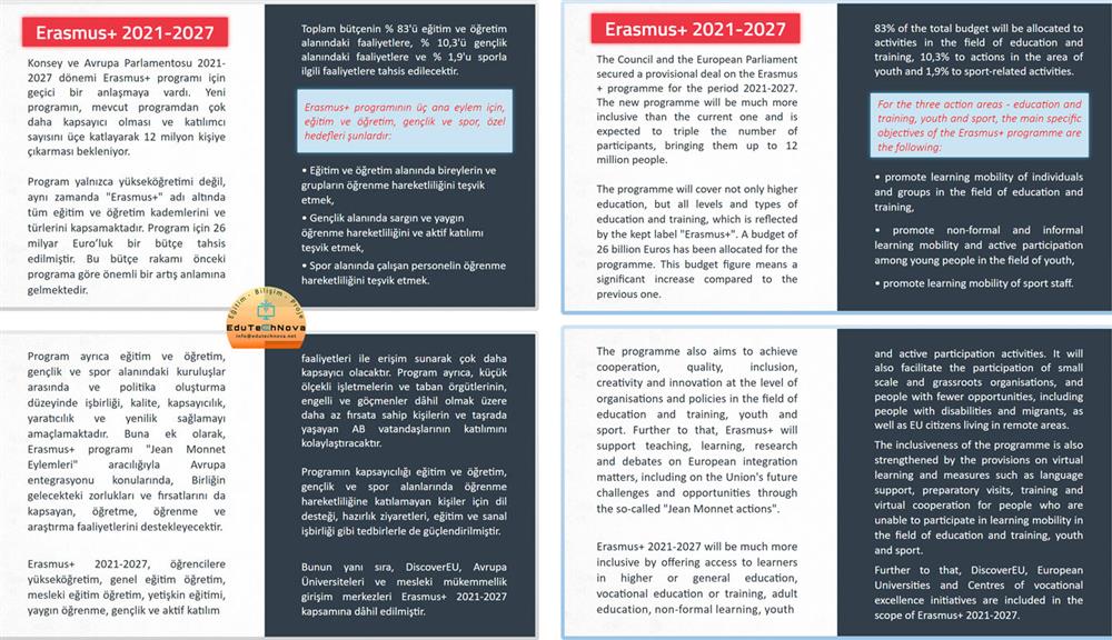Bunun yanı sıra, DiscoverEU, Avrupa Üniversiteleri ve mesleki mükemmellik girişim merkezleri Erasmus+ 2021-2027 kapsamına dâhil edilmiştir.