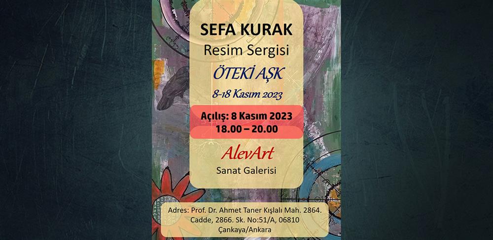Sefa KURAK kişisel resim sergisi. Sergi 08 Kasım 2023 tarihinde AlevArt Sanat Galerisinde açılmıştır. Açılış kokteyline katılan ve sergimizi ziyaret eden tüm dostlara ve sanat severlere teşkkür ederiz. Sizleri de sergimize bekliyoruz.